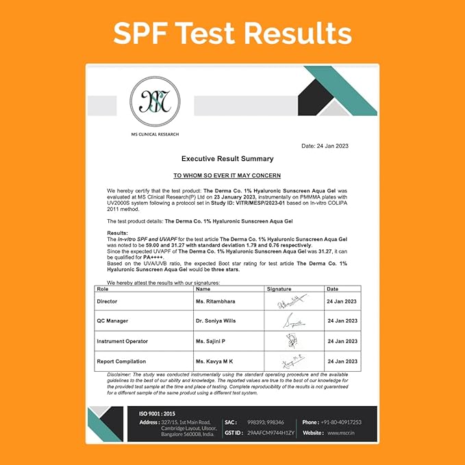 - NON-GREASY & FRAGRANCE-FREE: Say goodbye to the greasy and oily finish of typical sunscreens. The Derma Co. 1% Hyaluronic Sunscreen Aqua Gel is fragrance-free and doesn’t clog your pores. The presence of 1% concentration of Hyaluronic Acid in this sunscreen makes it quick to absorb and provides intense hydration to the skin. Extremely lightweight in nature, the sunscreen dissolves like water, hence the name ‘Aqua Gel’.