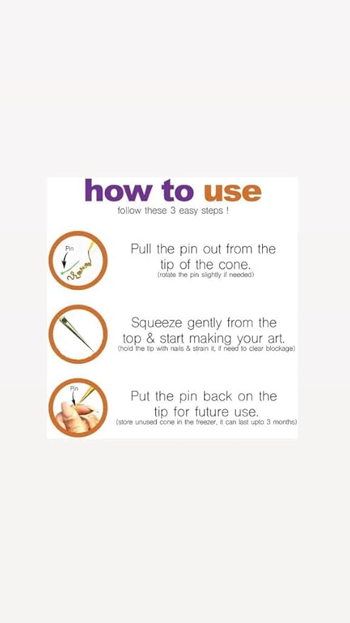 - PREMIUM QUALITY: Our henna is free from chemicals and is 100% Natural! Simply remove the tip and apply ! Cut the tip as needed. The longer the henna is left on the better the color results are. It is recommended to refrigerate or freeze the cones when not in use.