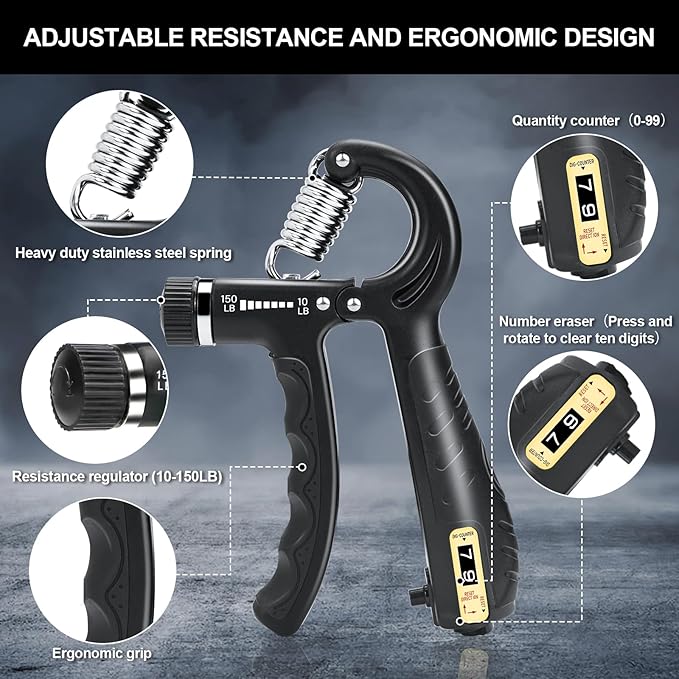 - ADJUSTABLE RESISTANCE - This grip strengthener can easily adjust the resistance level. The resistance adjustment button can adjust the resistance from 10 pounds to 150 pounds, and you can set different resistances according to your needs. It is super portable and allows you to exercise anywhere - at home, in the car, and in the office
