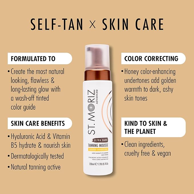 - Self-Tan to Complement Your Natural Skin Tone: With honey color correcting undertones to add warmth to dark, ashy skin tones, our Advanced Color Correcting Tanning Mousse in Ultra Dark creates the most natural looking, flawless deep tan. Our fast-drying formula applies smoothly and evenly, and the wash-off guide color ensures foolproof application. Includes one 230ml bottle.