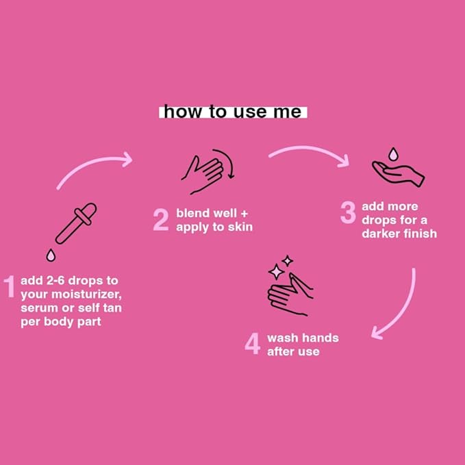 - SO EASY TO USE. shake gently before use. add drops to your daily moisturizer or serum. mix 2-6 drops per body part, blend well and thoroughly apply to skin lightly covering areas such as hands, elbows and feet. add more drops for even darker skin finish. wash hands after application. alternatively, add to your self tan foam or lotion to boost its depth of color.