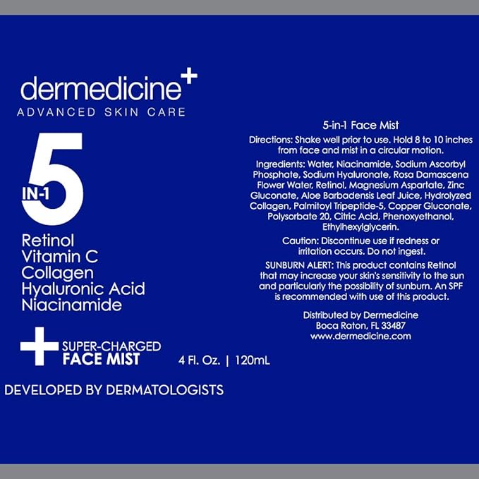 - MAY HELP REDUCE APPEARANCE OF FINE LINES: Our 5 in 1 spray mist is formulated with a powerhouse of actives that work to leave skin feeling more even, looking plump, appearing smooth, moisturized and hydrated. Regular use of our Retinol, Collagen, Hyaluronic Acid, Niacinamide, Vitamin C toner face spray may work to improve skin hydration, helping to reduce the appearance of fine lines and wrinkles. Our 5 in 1 facial hydrating mist instantly refreshes and revitalizes for younger looking skin
