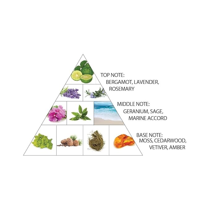- MIDDLE Notes - Geranium, Sea Notes and Sage ; Base Notes - Vetiver, Amber, Moss and Cedar.