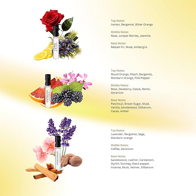 - Includes 2 ml each of: Empressa Eau de Parfum, Endymion Concentre, Halfeti Eau de Parfum, The Favourite Eau de Parfum, Portraits The Coveted Duchess Rose Eau de Parfum Portraits, The Tragedy of Lord George Eau de Parfum, Blenheim Bouquet Eau de Toilette, Juniper Sling Eau de Toilette, Luna Eau de Toilette, Quercus Eau de Cologne