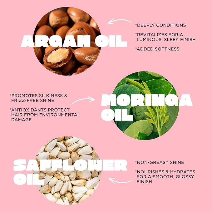 - ANTI-FRIZZ SHINE SPRAY: Buh-bye frizz and flyaways! By stirring in Safflower, Sweet Almond, Moringa, Argan Oil (and more) this delicate mist delivers mega shine and ultra static control. With humidity blockers, this product seals the cuticle protecting against frizz for up to 48 hours and shields against nasty environmental factors. Give your hair the ultimate radiance to glow. (hair types include: straight, wavy, curly).