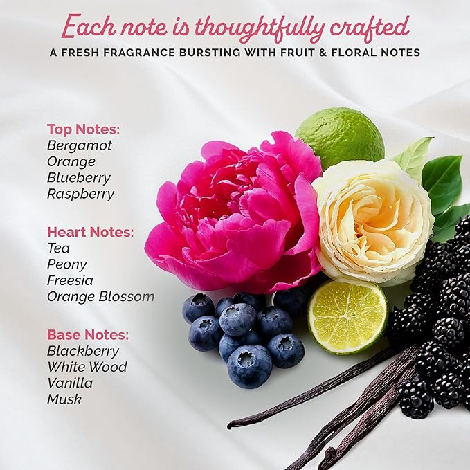 - OLFACTORY NOTES: Top Notes: Bergamot, orange, blueberry & raspberry. Heart Notes: Tea, peony, freesia & orange blossom. Base Notes: Blackberry, musk, vanilla & white wood.