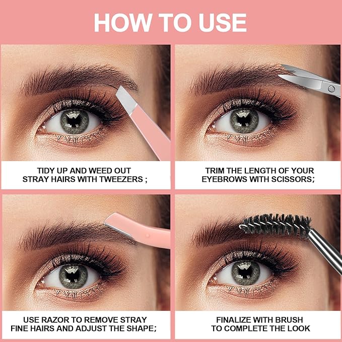 - Professional Eyebrow Grooming Kit: The eyebrow kit comes with 1pcs small eyebrow scissors curved tip, 1pcs eyebrow scissors rounded tip silver. 1pcs eyebrow tweezers slant tip, 1pcs eyebrow tweezers flat tip. 1pcs eyebrow razor and 1pcs eyebrow brush. Total 6pcs eyebrow trimming tools with leather travel case portable and orderly. One kit includes 6pcs practical and essential accessories for eyebrow.