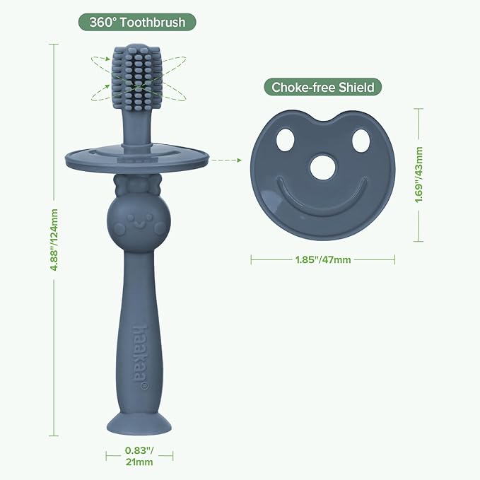 - INSTILL EARLY ORAL HYGIENE ROUTINES: The Haakaa 360° baby toothbrush with suction base is the perfect first toothbrush to set up good brushing habits from an early age. Suitable to use even before baby’s first teeth emerge.
