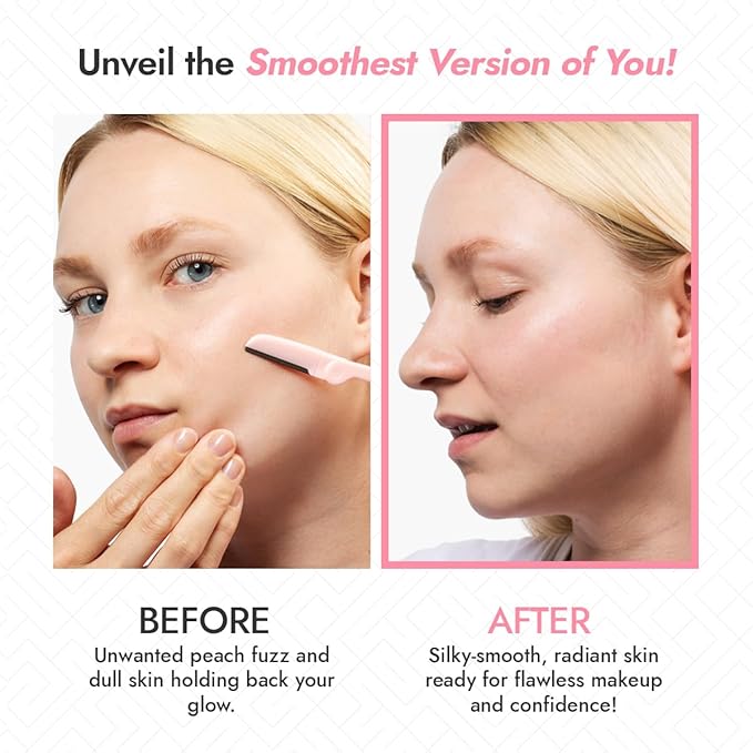 - EFFORTLESS HAIR REMOVAL: Our sleek pink dermaplaning razor makes it simple to clear away unwanted facial hair and dead skin. The high-grade stainless steel blade reveals a smoother, glowing complexion, setting the stage for perfect makeup application.