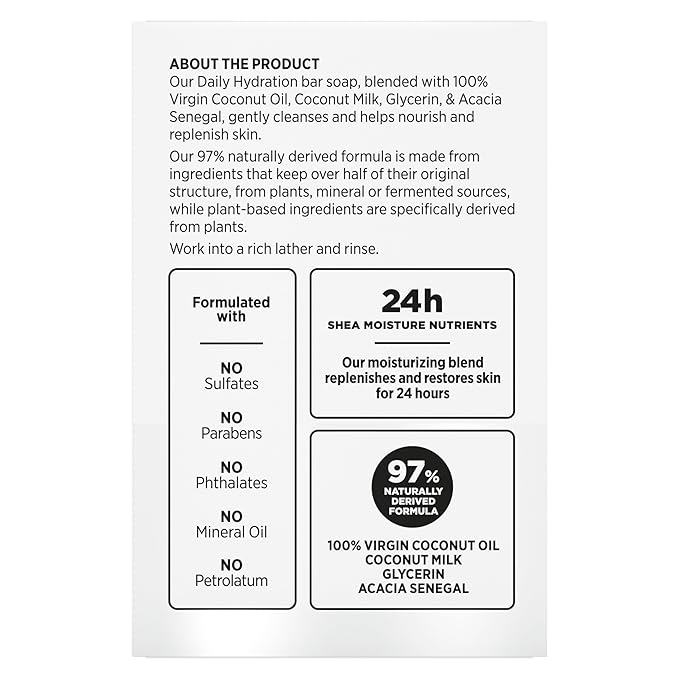 - SheaMoisture's 100% Virgin Coconut Oil Daily Hydration Bar soap, designed for melanin-rich skin, replenishes and restores skin for 24 hours.