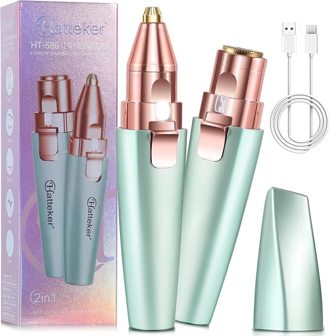 Hatteker Eyebrow Facial Trimmer, 2 in1 Rechargeable Hair Removal and Eyebrow Shaver - Face Lips Body Painless Razor with Built-in LED Light (Green)