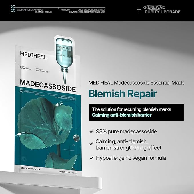 - [Power improvement from soothing to skin barrier] - Mediheal’s madecassoside essential sheet mask effectively calms visible redness and blemishes. Deep hydration from skin inside, improving skin texture and strengthening the skin barrier.