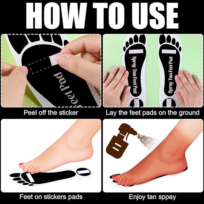 - How to Apply: there are stickers on the spray tan feet pads, just peel off the outer adhesive strips and then stick them to your feet, not easy to fall out, they are also convenient to remove, saving you time and effort