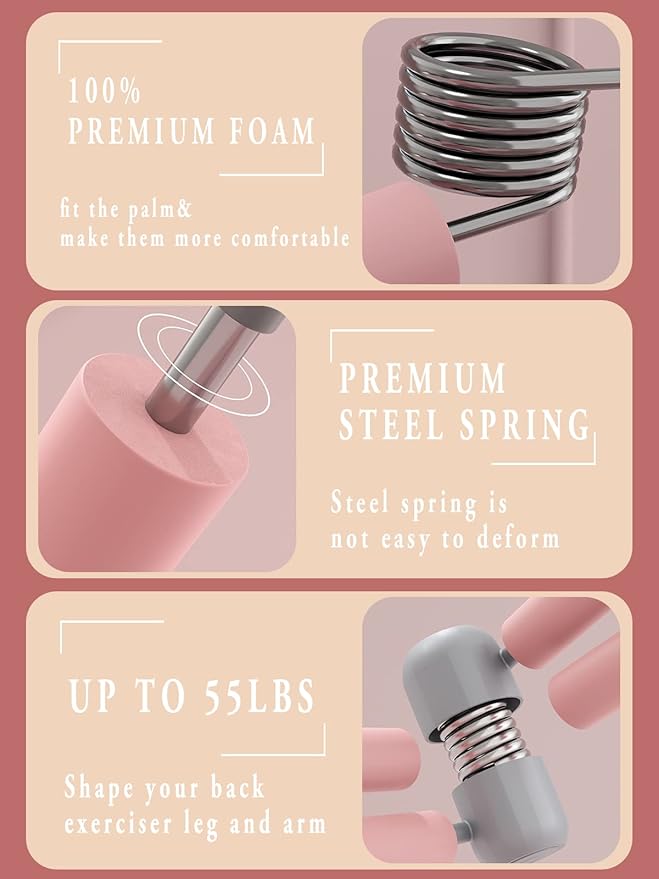 - Quality materials: Our inner thigh exercisers are mainly made of PVC. The foam handle absorbs sweat from the hand and fits the palm for comfort. Steel springs do not deform easily.
