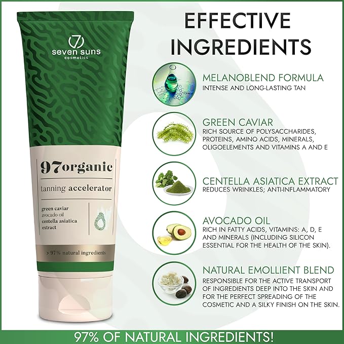 - KEY INGREDIENTS: Melanoblend formula - a unique complex of ingredients of natural origin, strongly influencing the acceleration of the appearance of an intense and long-lasting tan. Green caviar- It attracts and binds water like a sponge. Rich source of polysaccharides, proteins, amino acids, minerals, oligo-elements and vitamins A and E, Centella Asiatica extract, Avocado oil, and a mix of natural emollients.