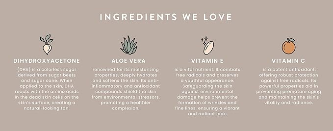- SKINCARE MEETS SELF TANNING SOLUTION: We've harnessed the skincare benefits of Aloe Vera. Aloe Vera deeply moisturizes the skin, while the DHA actively develops your new self tan. Aloe vera also extends your tanβs life by up to three days compared to other brands! While it might feel slightly thicker on the skin during tan development, the results are well worth it, as you'll enjoy a radiant glow for days!