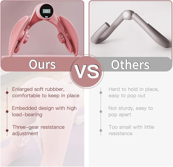 - 【USER-FRIENDLY DESIGN】- Our inner thigh exercise equipment, learning from the shortcomings of the small and cheap trainers, has been upgraded in design. It is designed into oval shape on sides to increase the contact surface with user’s skin. Thus, not only user's flesh will not be pinched, but also the trainer will not pop out during use. Moreover, the PTE soft rubber is enlarged, so the user will feel comfortable when using.